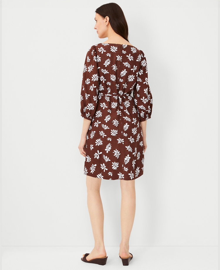 Petite Leafed Linen Blend Puff Sleeve Shift Dress