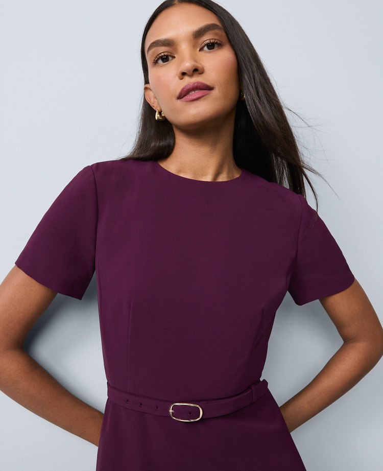 Our belted crew neck midi dress is a go-to you’ll wear year after year. Crew neck. Short sleeves. Adjustable buckle belt. Hidden back zipper with hook-and-eye closure. Lined body.