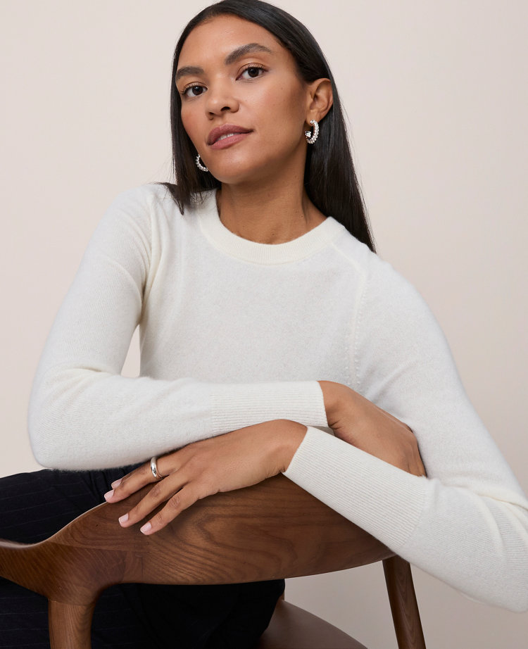 With detailed saddle shoulders, our rich cashmere sweater is touchably soft and endlessly luxe. Crew neck. Long sleeves. Saddle shoulders. Ribbed neckline, cuffs and and hem.