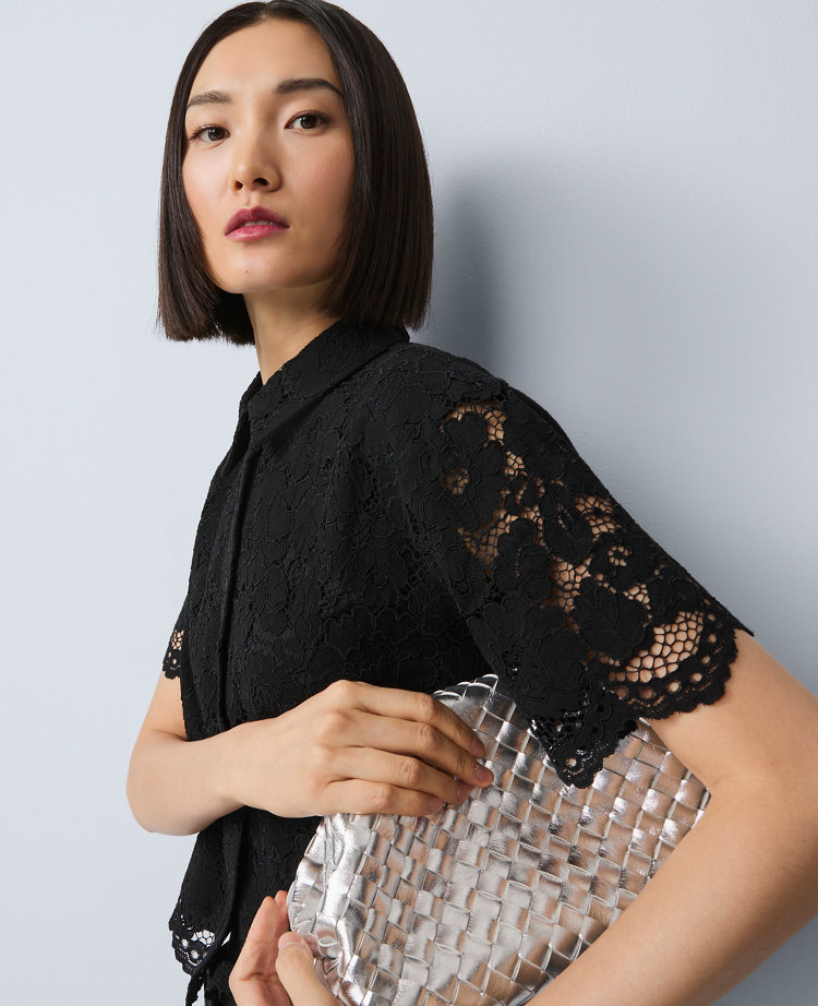 A crisp and clever staple with a buttoned front and cropped sleeves, this eyelet blouse is both fresh and feminine. Point collar. Front button closures. Short sleeves.