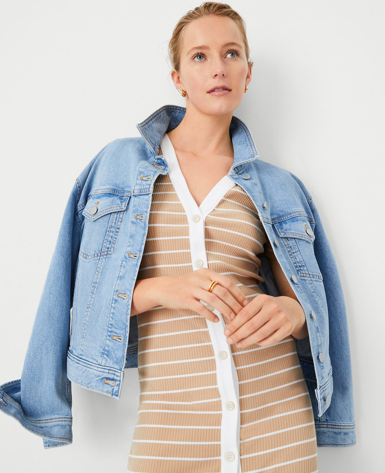 Introducing Ann Taylor Weekend – relaxed separates and easy pairings that take the work out of getting dressed. V-neck. Short sleeves. Button front placket.