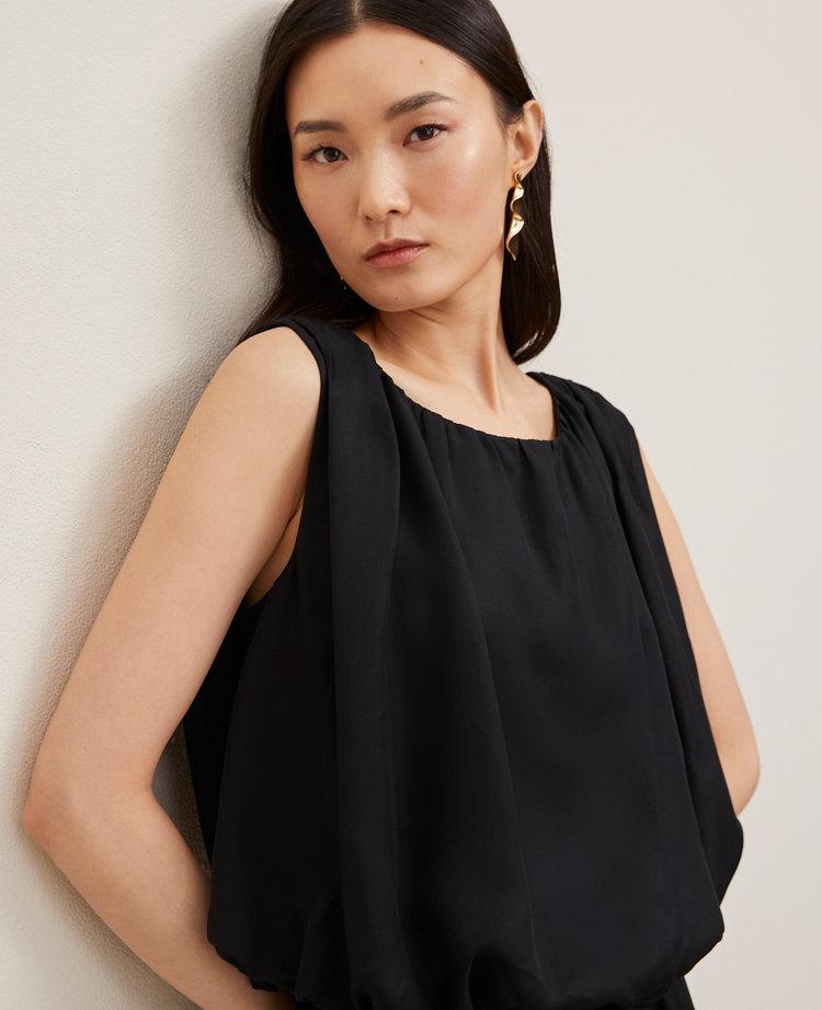 A bubble hem shapes this airy tank top with a sense of romance. Round neck with shirring. Sleeveless. Elasticized hem. Lined.