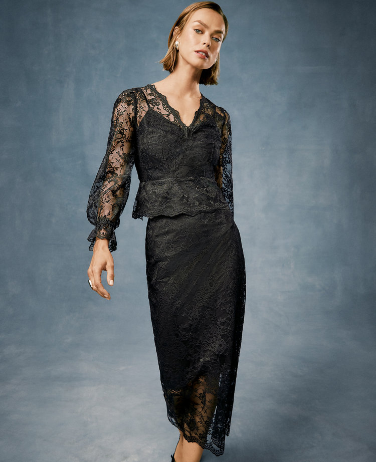 Designed in feminine lace with a scalloped hem, this skirt boasts an impeccably streamlined silhouette. Hidden back zip closure. Back vent. Lined.