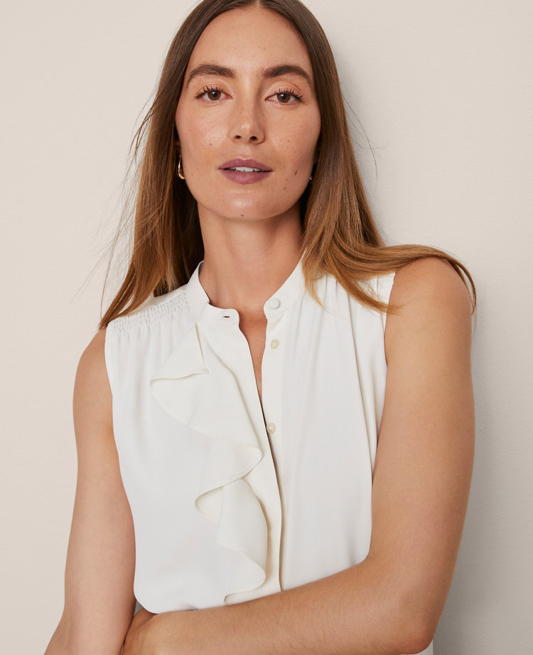 With a cascade of ruffles along the front, this chic top brings beautiful, elegant movement to any look. Crew neck. Front button closures. Sleeveless.