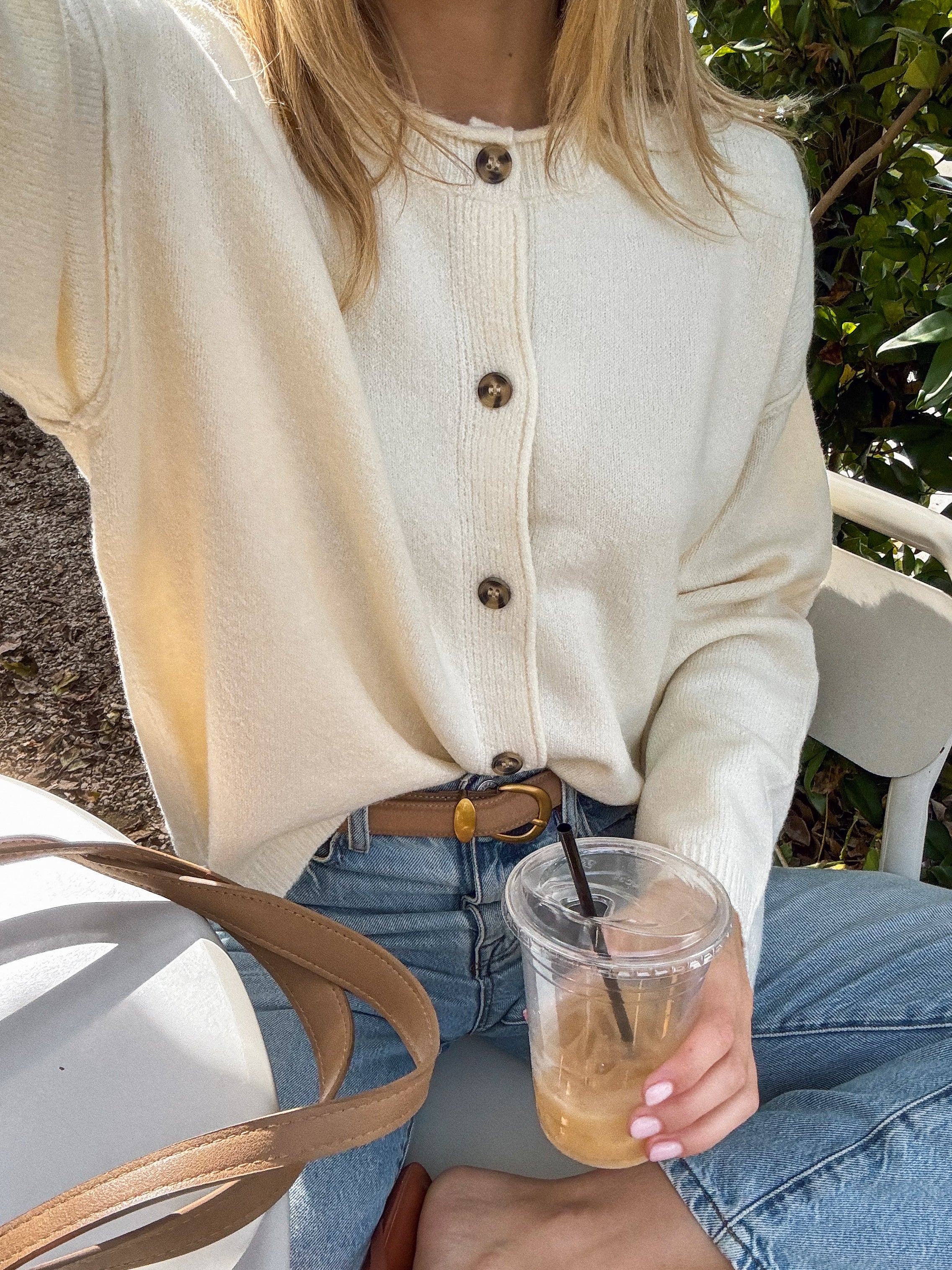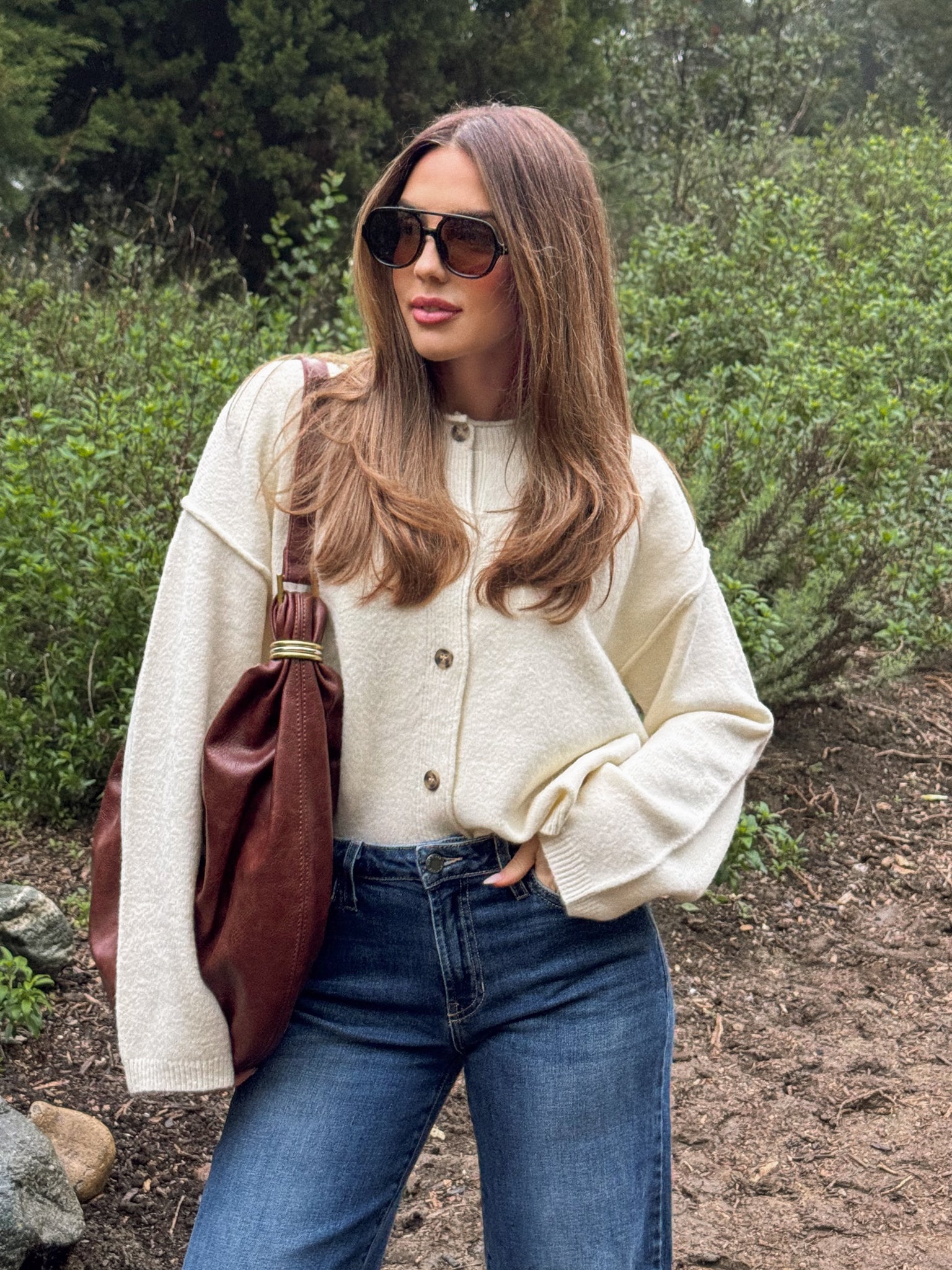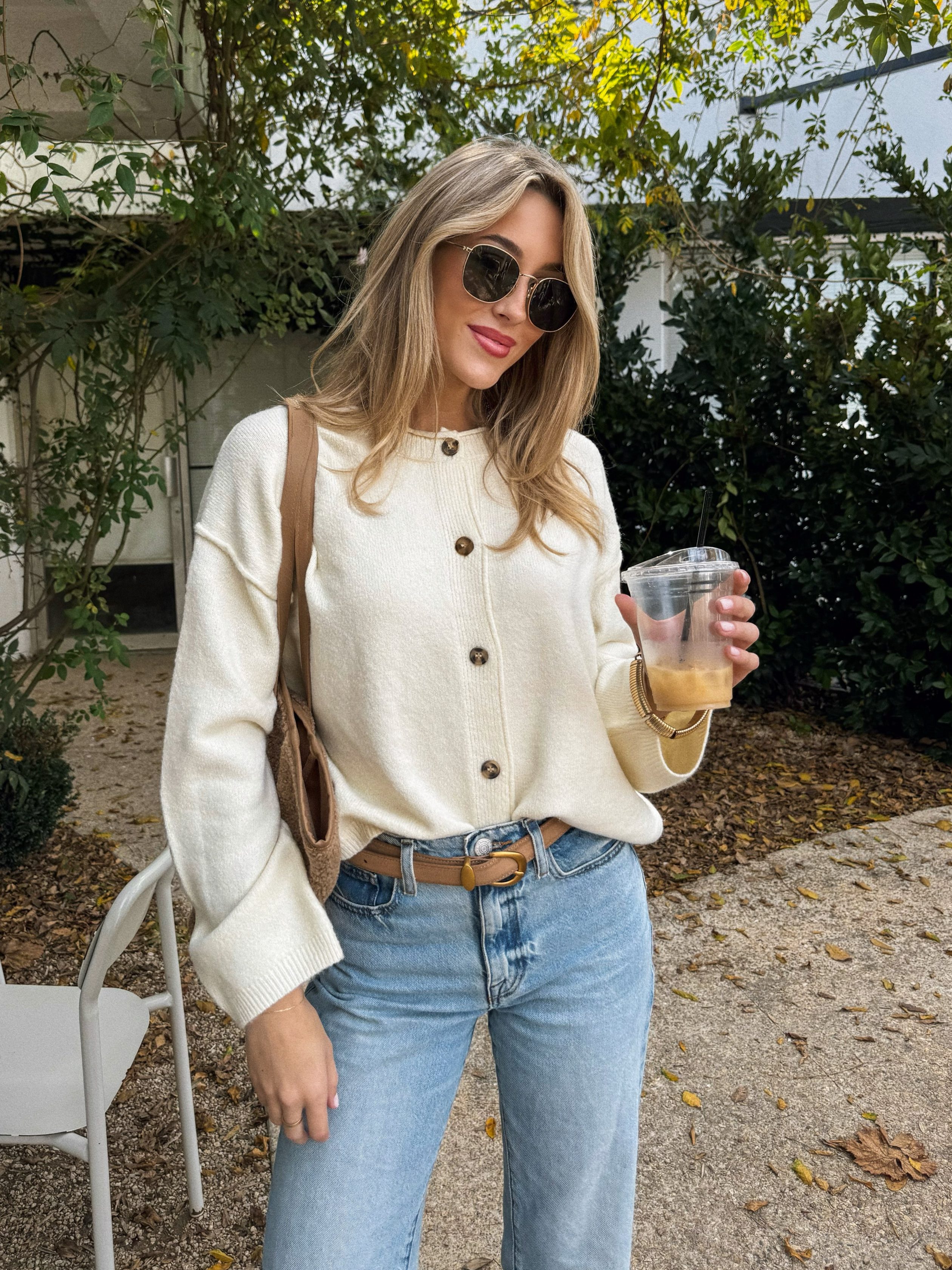 Style our new Stevie Button Knit Sweater buttoned with a white tee underneath. black trousers. white crew socks. and black loafers for a chic and preppy look. Accessorize with a belt and leather tote bag to elevate the look!