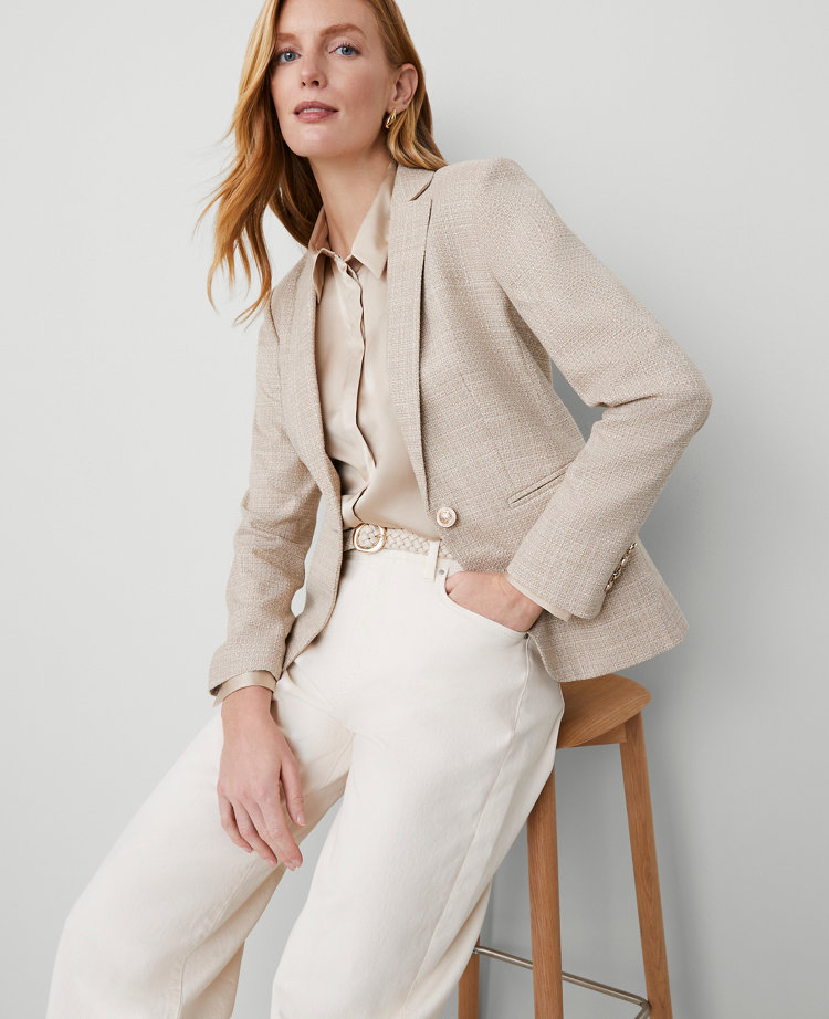 Structured and modern with a custom tailored feel, our classic blazer is a modern suiting essential. Notched lapel. Long functional button sleeves allow for versatility in styling. One-button front. Front besom pockets. Back vent. Lined.