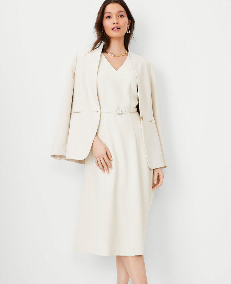 Our belted V-neck midi dress is a go-to you’ll wear all season long. Front and back V-neck. Cap sleeves. Self tie buckle belt. Hidden back zipper with hook-and-eye closure.. Lined.