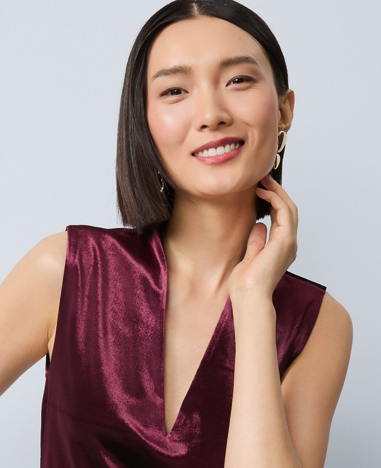 With clean lines and a flattering V-neck, this understated top keeps every outfit streamlined. V-neck. Sleeveless.