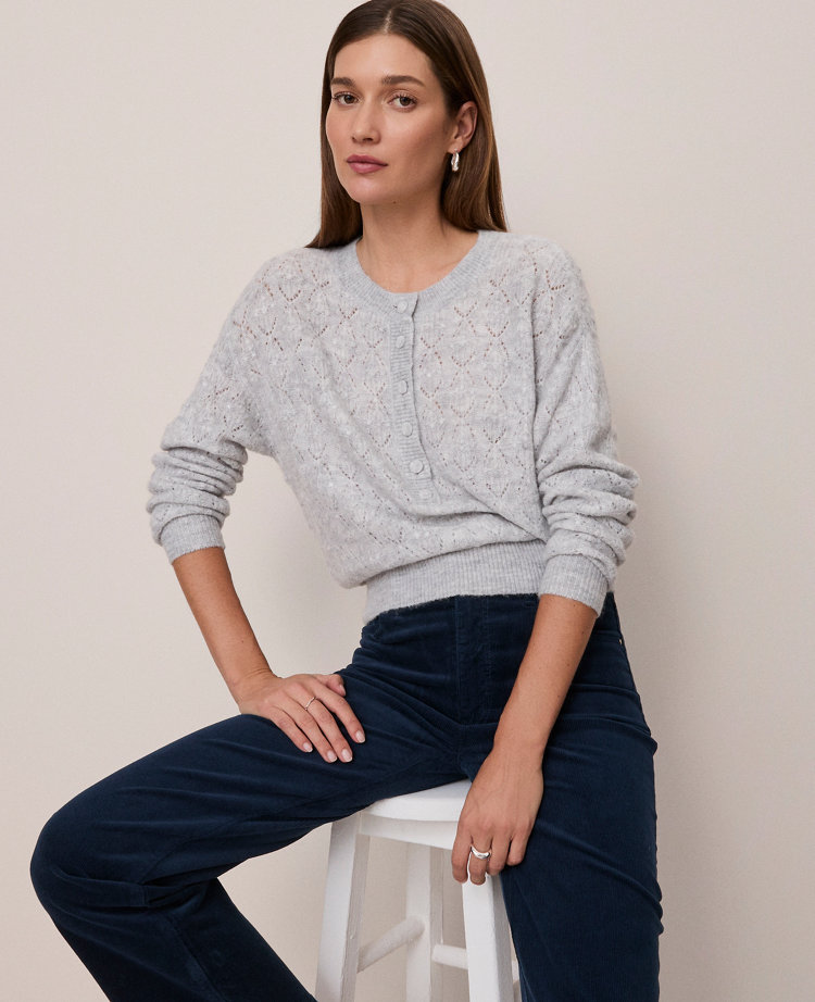 Discover Ann Taylor Weekend. Effortlessly polished, lived-in looks for wherever your plans take you. A classic Henley neckline lends a modern finish to this beautiful pointelle sweater. Ribbed crew neck, cuffs and hem. Front Henley button placket. Dropped shoulders. Long sleeves.