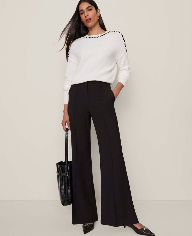 Intricate whipstitch detailing adds an artisanal feel to this chic and versatile sweater. Crew neck. Ribbed long sleeves, cuffs, and hem. Dropped shoulders.